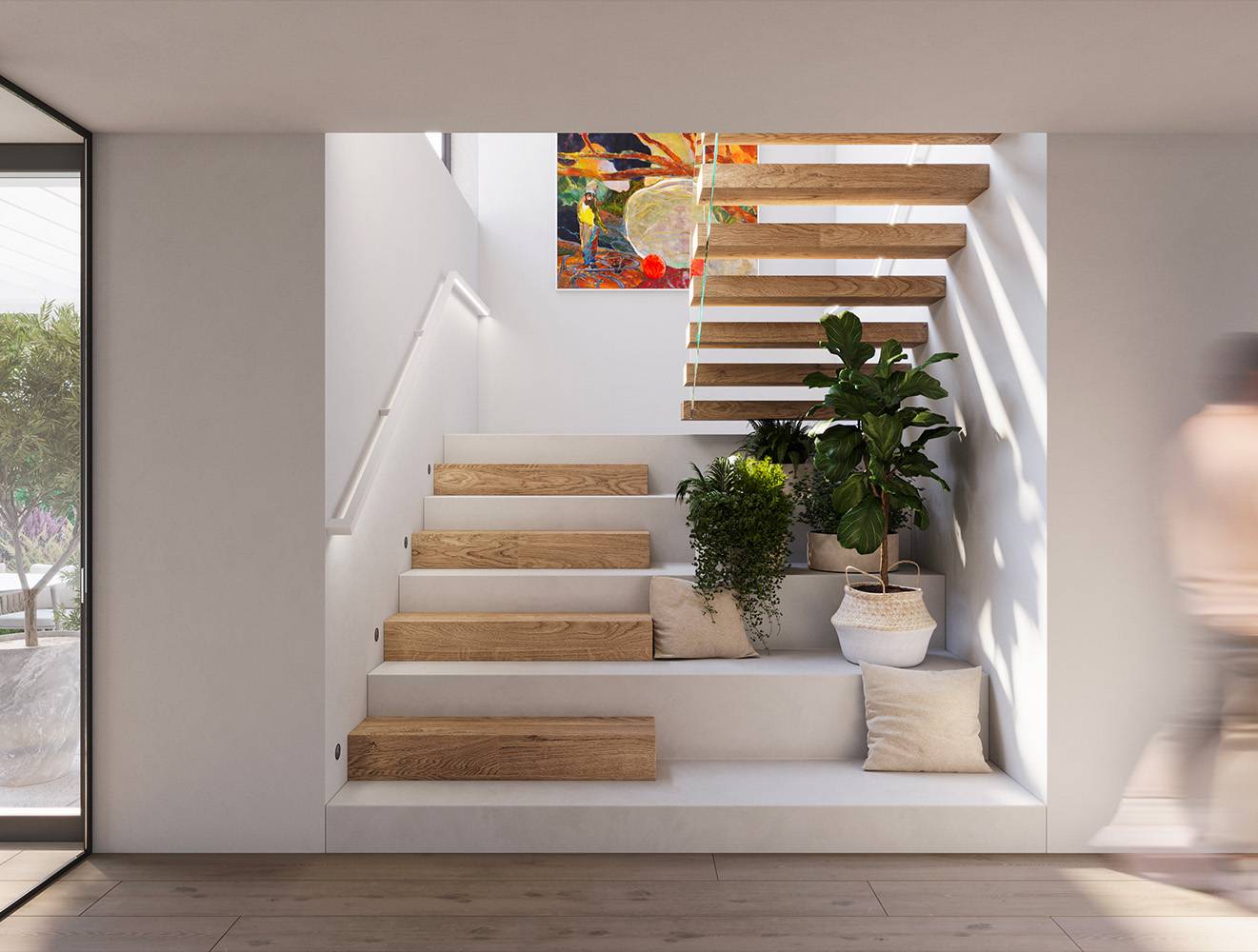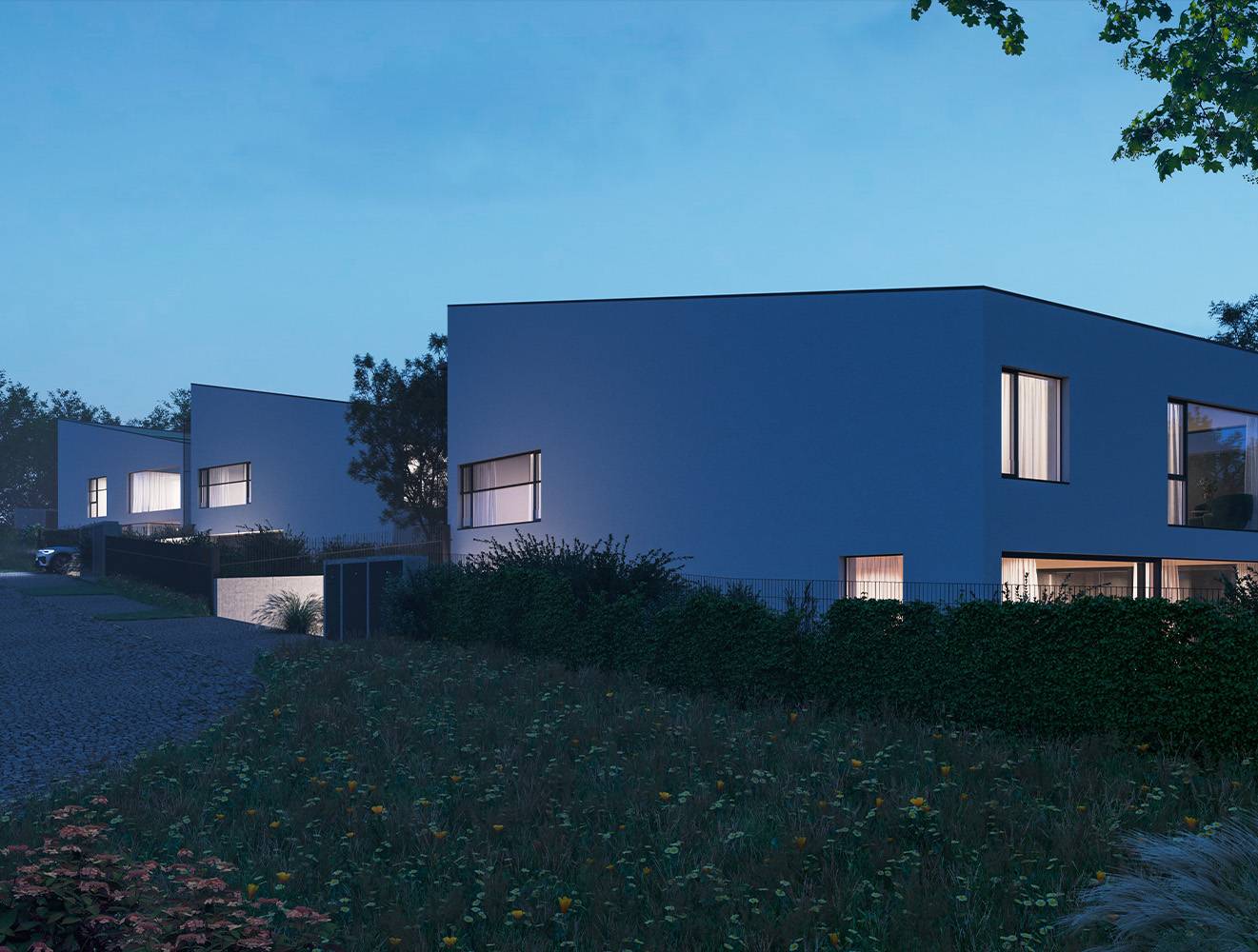 Dům disponuje celkem čtyřmi parkovacími místy, z toho jsou dvě uvnitř a dvě venku. Garáž v prvním nadzemním podlaží nabízí dostatek místa pro větší auta a vybudování praktických úložných prostor, mimo hlavního vchodu také slouží ke vstupu do domu. Prostorné zádveří navazuje na vzdušnou chodbu, kde mohou být umístěny vestavěné skříně a plynule navazuje na schodiště, které vede do přízemí. První patro domu je dedikováno soukromí, přičemž spodní slouží naopak jako společenská zóna. V horním patře se nachází celkem tři pokoje. Hlavní ložnice o velikosti 17,8 m2 disponuje stylovou průchozí šatnou a privátní koupelnou se sprchovým koutem. Dva zbylé pokoje o velikosti 13,8 m a 15,7 m mohou být využity jako dětské pokoje, náleží k nim na chodbě umístěná koupelna s vanou a dvojumyvadlem, toaleta je umístěna separátně. Dále se zde nachází technická místnost vhodná jako prádelna.