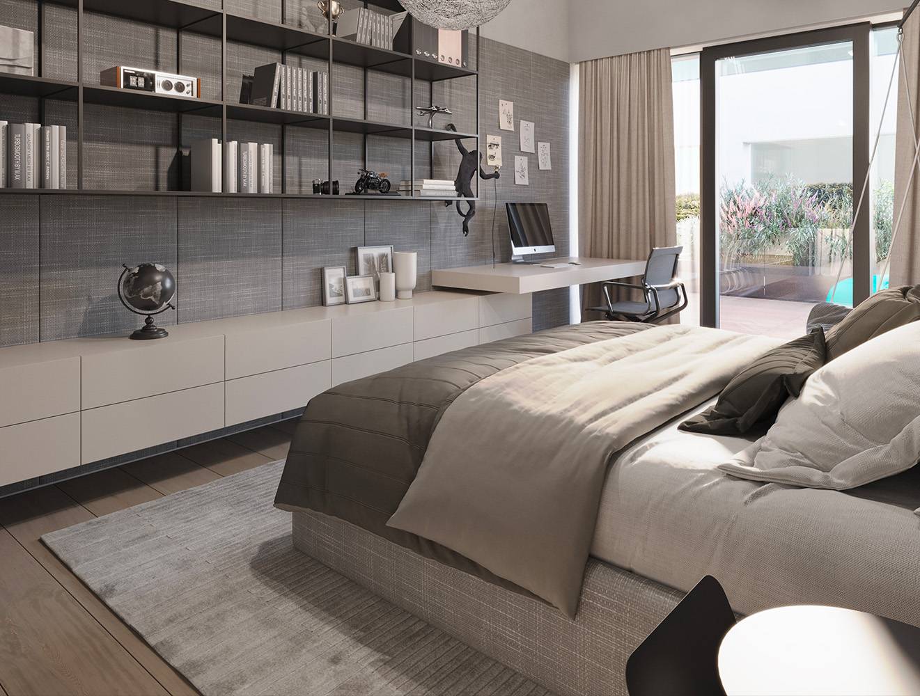 Díky velkoformátovým oknům jsou všechny pokoje plné denního světla a nabízí nádherné výhledy do zelené zahrady. Vzdušné schodiště vedoucí do nižšího patra vily ústí do chodby, která odděluje prostorný obývací pokoj spojený s kuchyní od zbylých místností. Snadno Vás nadchne svou nadstandardní velikostí 78,5 m2 a ihned se stane oblíbeným místem pro společné chvíle s těmi nejbližšími. Kuchyň s moderním ostrůvkem s barovým posezením, navazující jídelnou s dostatkem prostoru pro umístění velkého stolu plynule navazuje na obývací pokoj. Tato část je určena pro odpočinek na pohodlné pohovce, ze které můžete s klidem sledovat zelenící se okolí. Díky velkoformátovým oknům je pokoj přirozeně rozšířen o velkou terasu s plochou 26,7 m2, ke které přiléhá venkovní bazén. Výhřev bazénu zajišťuje tepelné čerpadlo. Ve zbylé části domu se nachází další pokoj o velikosti 13,7 m2 s vlastní koupelnou se sprchovým koutem a může posloužit jako pracovna nebo pokoj pro hosty.