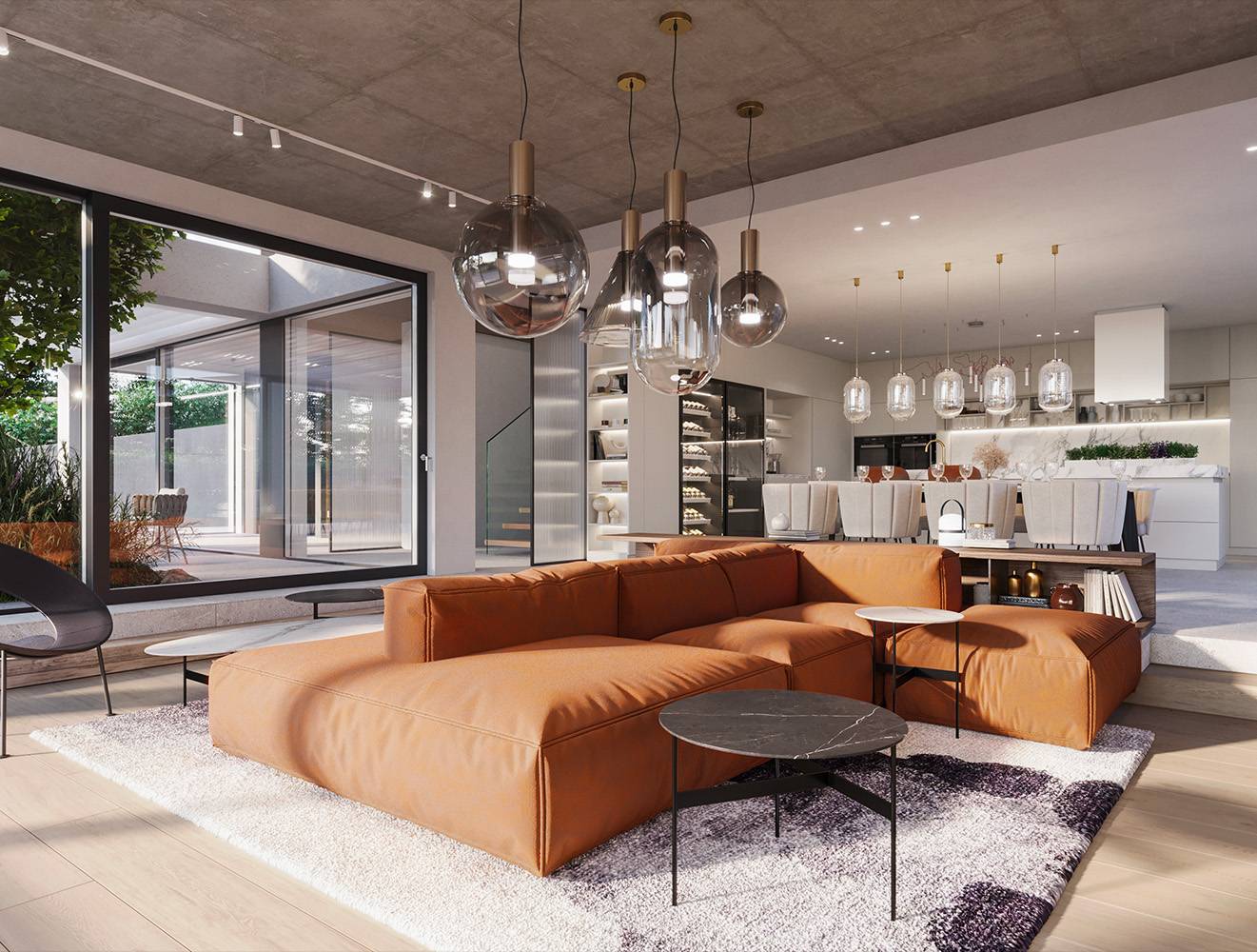 Díky velkoformátovým oknům jsou všechny ložnice plné denního světla a nabízí uklidňující pohled do zelené zahrady, na řeku a do širokého okolí. Schodištěm se dostaneme do primárně společenského přízemí vily. Této části domu vévodí nadstandardně velký obývací pokoj o velikosti 87 m2. Ozdobou tohoto prostoru je otevřená kuchyně s moderním kuchyňským ostrůvkem s barovým posezením, na který navazuje jídelní část, která počítá s velkým stolem a pohodlným posezením. I spodní části dominují velkoformátová okna, která důmyslně propojují interiér s exteriérem. Vzdušnost a propojenost obývacího pokoje s okolní zahradou podtrhují dvě přiléhající terasy. Na hlavní terase je počítáno s umístěním venkovního jídelního stolu a grilu.