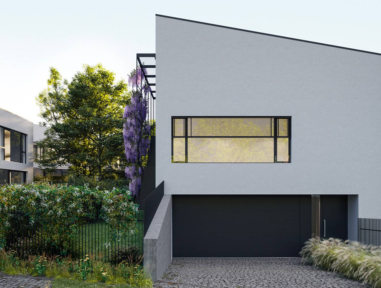 Umístění domu v dostatečné vzdálenosti od sousedních parcel zajišťuje soukromí, kterému také napomáhá orientace většiny prosklených ploch směrem do zahrady a údolí. Dům disponuje celkem čtyřmi parkovacími místy, z toho jsou dvě garážové a dvě venkovní. Garáž nabízí dostatek místa pro větší auta a vybudování praktických úložných prostor, z té lze pohodlně vstoupit přímo do domu. Prostorné zádveří navazuje na vzdušnou chodbu se schodištěm do druhého patra. Dům je rozdělen na společenskou část v přízemí a privátní zónu v prvním nadzemním podlaží. Spodní patro je tvořeno nadstandardně rozlehlým obývacím pokojem s otevřenou kuchyní včetně moderního kuchyňského ostrůvku s navazující jídelnou. Díky velkoformátovým oknům je obývací pokoj přirozeně rozšířen o velkou terasu s plochou 72,5 m2.