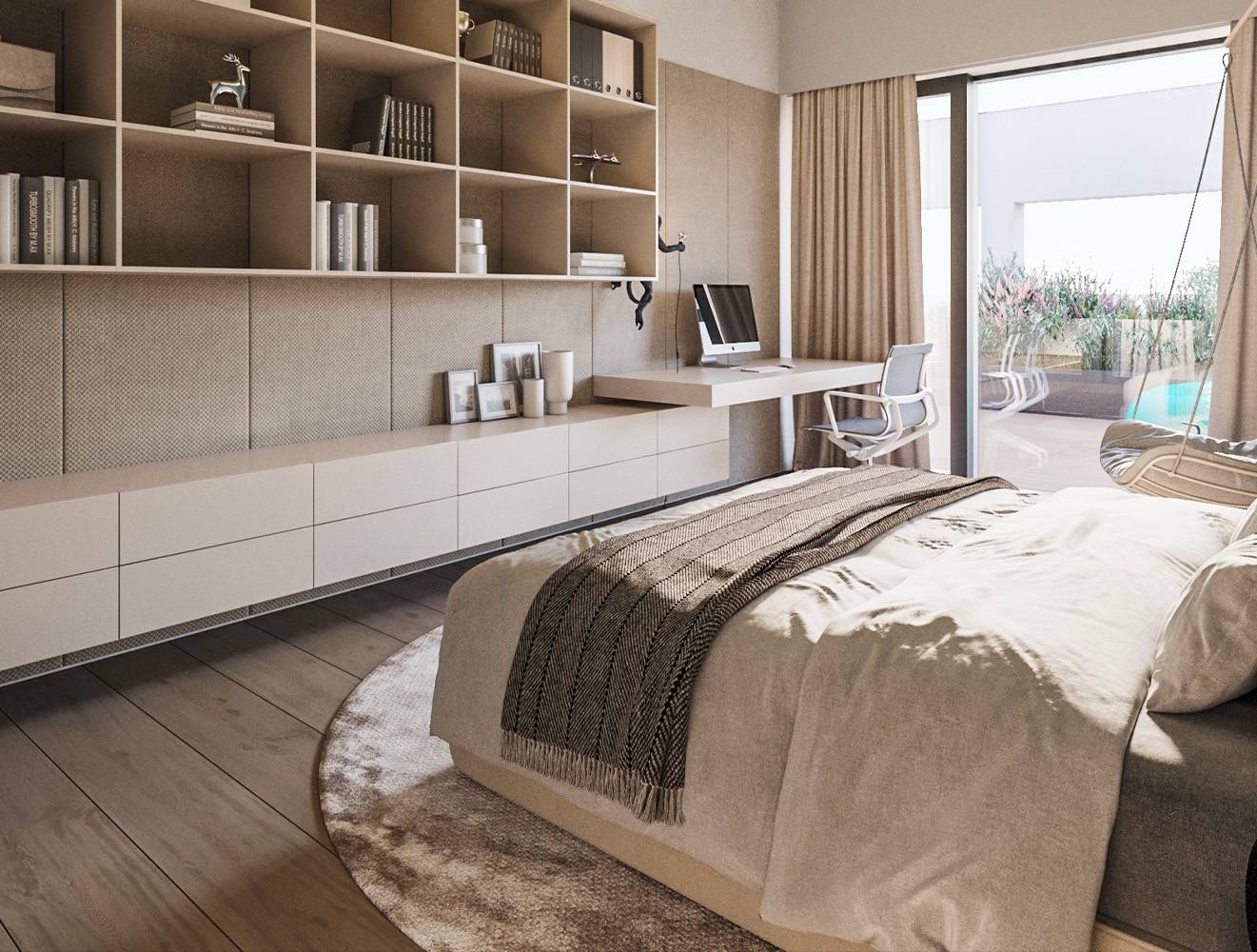 Na terasu lze vstoupit i z luxusního wellness, kde je počítáno s umístěním vířivky, sauny a sprchového koutu. Chvíle odpočinku si můžete s rodinou či přáteli užít v přiléhajícím venkovním bazénu, jehož vyhřívání zajišťuje vlastní tepelné čerpadlo. Spodní patro dále nabízí praktickou spíž, sklad a toaletu. Součástí patra je praktická místnost se vstupem ze zahrady, která může posloužit například pro uložení zahradního náčiní a nábytku. Pro snadnou údržbu zahrady je počítáno s umístěním zavlažovacího systému s napojením na retenční nádrž. Druhé patro domu je vyhrazeno čistě pro soukromí obyvatel. Nachází se zde hlavní ložnice a další tři pokoje. Hlavní ložnice má téměř 30 m2, náleží k ní stylová průchozí šatna o velikosti 17 m2 a vlastní prostorná koupelna s vanou, sprchovým koutem, moderním dvojumyvadlem a oddělenou toaletou s bidetem. Koupelnou a šatnou disponuje i další ložnice s výměrou 23 m2. Zbylé dva pokoje o velikosti 18 m2 mají na sebe navazující walk-in šatny, ke kterým náleží společná koupelna s vanou, sprchovým koutem a samostatnou toaletou.