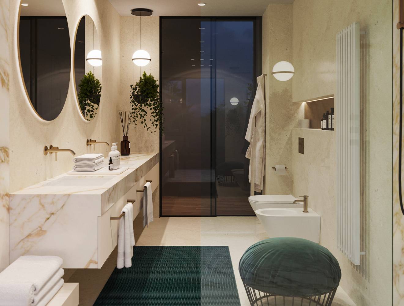 Součástí přízemí je i garáž pro dvě větší auta a vybudování praktických úložných prostor. Druhé patro domu tvoří soukromou část rezidence a nabízí celkem 4 velmi prostorné ložnice a 4 koupelny. Hlavní manželskou ložnici tvoří několik na sebe navazujících prostor. Vchází se skrze elegantní šatnu o ploše 23 m2 , která ústí do privátní koupelny a velkorysé spací části o velikosti 30,4 m2 . Koupelna je vybavena vanou, sprchovým koutem, moderním dvojumyvadlem a toaletou s bidetem. Další dva pokoje jsou taktéž vybaveny vlastní šatnou, prostornou koupelnu se sprchovým koutem, vanou, dvojumyvadlem a separátní toaletou s bidetem však mají společnou. Poslední pokoj s výměrou 26,3 m2 disponuje vlastní koupelnou s toaletou a sprchovým koutem.